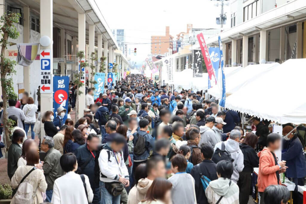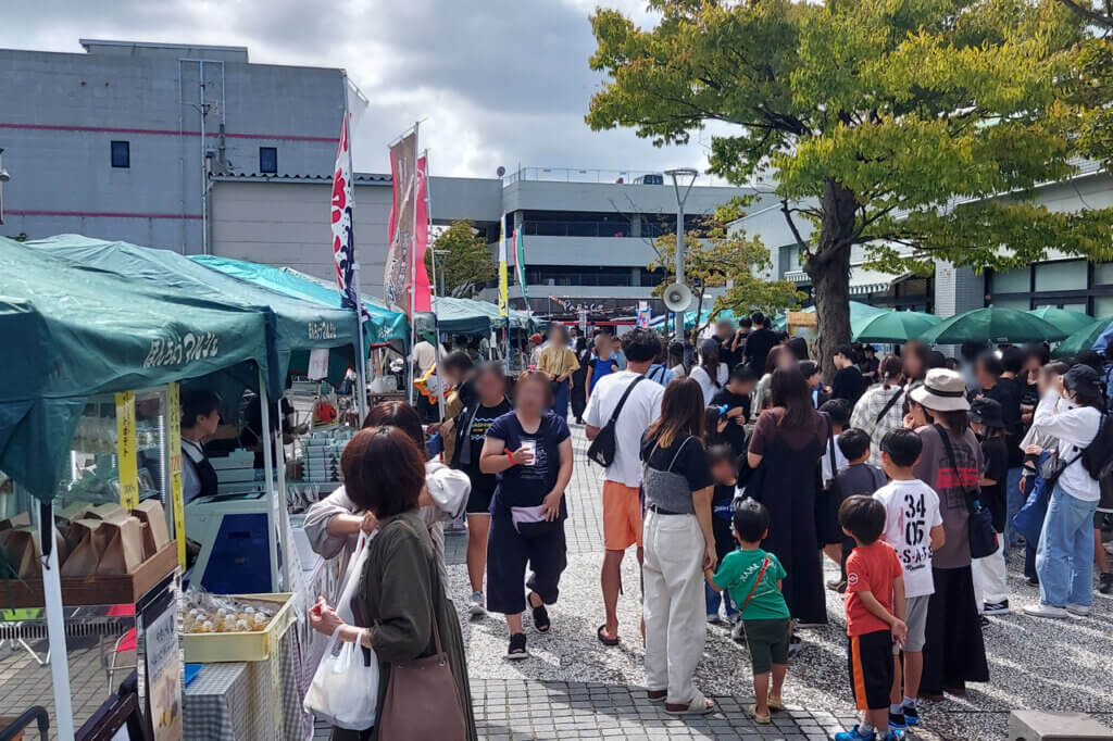 飲食や雑貨、体験など、29店舗がフォンジェストリート棟前道路に所狭しと出店し、多くの人でにぎわうマルシェ。ダンスステージや大抽選会などの催しのほか、当日は本町通り周辺各所で地元ミュージシャンがサーキット方式で演奏する音楽イベント「音市場」が開催されており、生演奏を楽しむことができます。