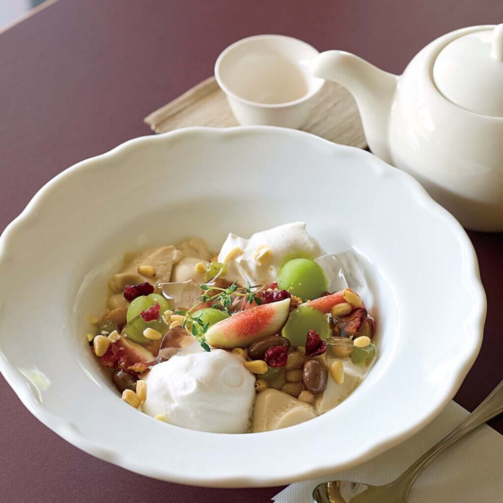 スープパフェ(1,485円)は、スープボウルにプリンや季節のフルーツが盛り付けられたこちらならではの一品です。