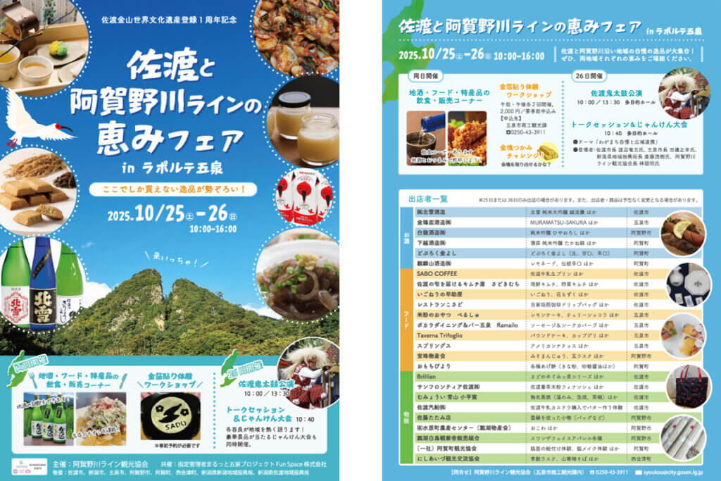 佐渡市と五泉市をはじめとする阿賀野川沿い地域の特産品が勢ぞろいするほか、各首長によるトークセッション、佐渡芸能「鬼太鼓」の披露、酒蔵による日本酒の試飲販売など、同地域の魅力を余すことなく発信。じゃんけん大会や金塊つかみなど、子どもが楽しめる催しもあるので、ファミリーでぜひ。