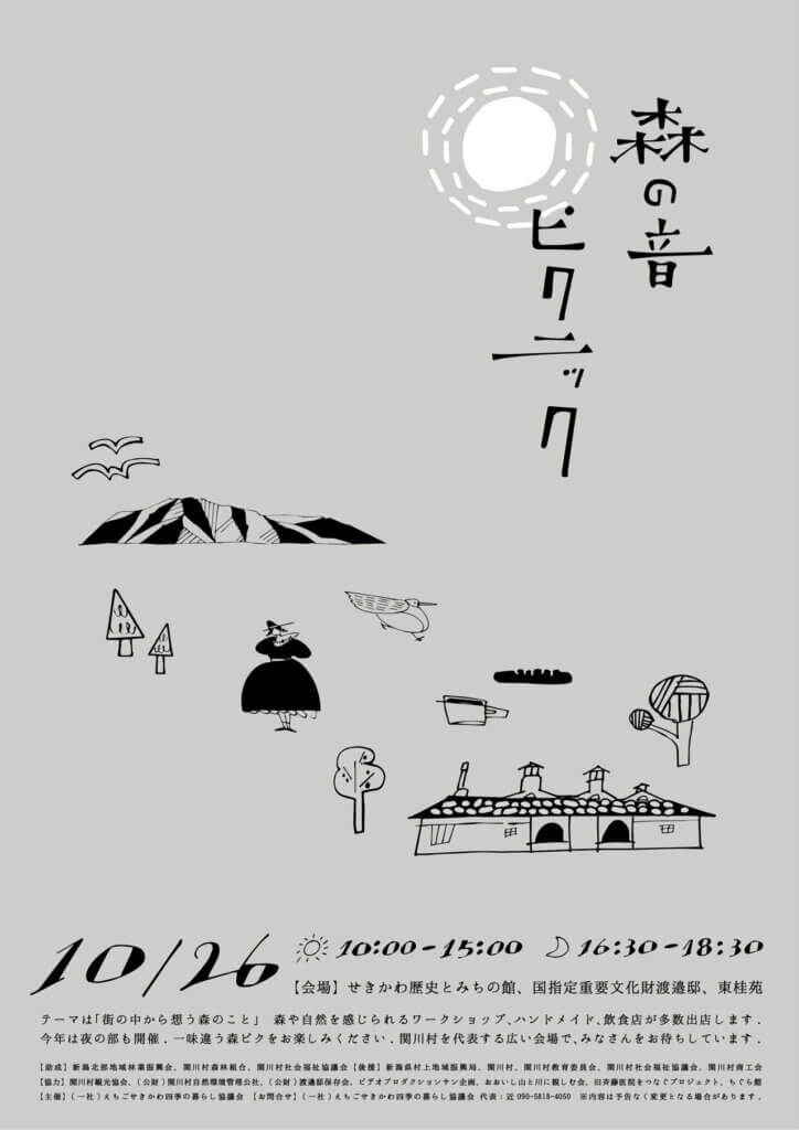 「街の中から想う 森のこと」をテーマに開催される催し。当日は、「せきかわ歴史とみちの館」の芝生広場が、天然素材を使ったワークショップや物販のお店11店舗が出店する「遊びエリア」に。「国指定重要文化財渡邉邸」の裏門広場が、多国籍のフードや、森や自然をほうふつさせるキッチンカーなど、15店舗が出店する「食べ物エリア」に。さらに、東桂苑の庭が、天然素材を生かしたクラフトのお店8店舗が出店する「買い物エリア」になり、3カ所を巡ってイベントを楽しめます。オープニングは、オカリナ、ンビラなど音楽も盛りだくさん。今回は夜の部も開催予定で、16時30分からは関川の酒屋丸重商店やちぐら館も出店。ちょっと大人の“森ピク”を楽しみましょう。