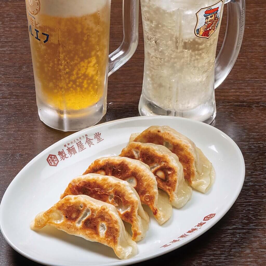 長岡の老舗食堂・金子屋の餃子を村上で味わえます。ショウガやシソもあり。