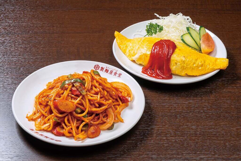 トマトケチャップの酸味が効いた昔ながらのナポリタン(810円)と、幅広い世代に人気のオムライス(970円)。