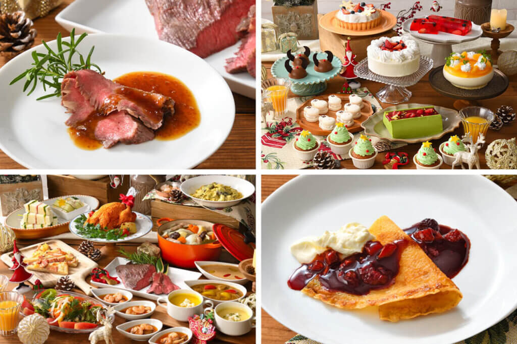 クリスマスシーズンのランチ&スイーツビュッフェは、トナカイをモチーフにしたショコラムースやクリスマスツリーカップケーキなど、カラフルなクリスマススイーツが勢ぞろい。シェフコーナーには、人気のローストビーフのほか、エビと県産キノコたっぷりのアヒージョが登場。土・日曜・祝日には、もっちりした食感のスウェーデンのパンケーキ「パンカーカ」も味わえます。
