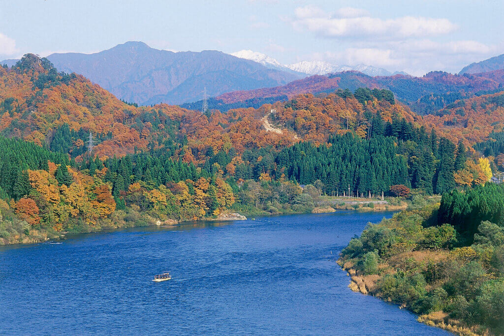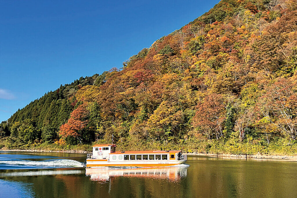 「新日本百景」に選ばれた、阿賀野川沿いの人気ドライブコース。紅く染まる麒麟山をはじめとした山々と雄大な阿賀野川のコントラストは見応え抜群で、進むたびに違った表情を楽しめる。「道の駅阿賀の里」発着の阿賀野川ライン遊覧船に乗れば、心地良い秋風とともに景色を堪能できる。
