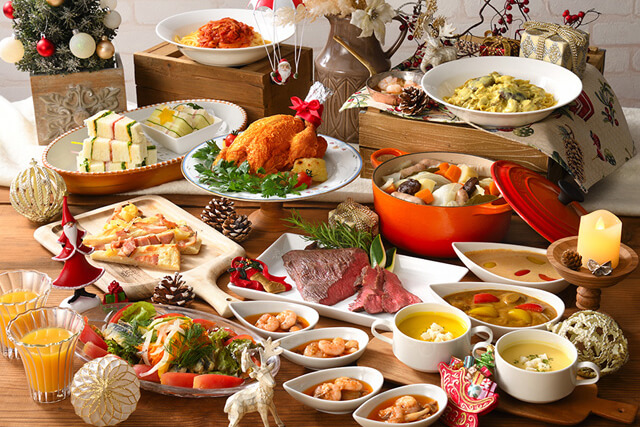 クリスマスメニューが勢ぞろいするディナービュッフェ。クリスマス気分を盛り上げてくれるかわいらしいスイーツが勢ぞろい。シェフコーナーには人気のローストビーフと、エビと県産キノコのアヒージョが登場します。さらに、土・日曜・祝日には、もっちり食感の生地がたまらないスウェーデンのパンケーキ「パンカーカ」を味わえます。