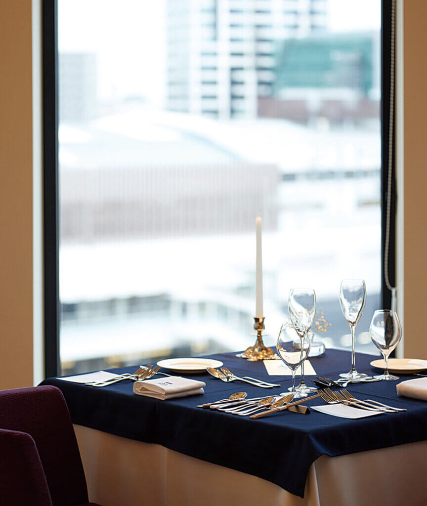 連日多くの人々がせわしなく行き交うJR新潟駅前エリア。そんな光景を一望しながら、コース仕立てのカジュアルフレンチを味わえる名店がこちら。駅前にそびえ立つマルタケビル8階に位置し、高級感のある扉を開くとそこには非日常な空間が広がる。