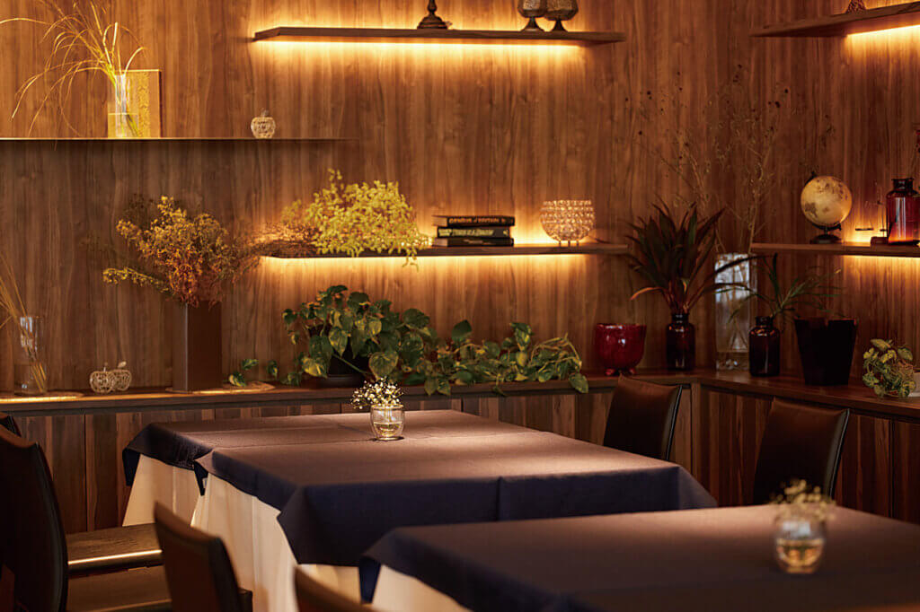 落ち着いた雰囲気の店内は女子会や、特別な日の利用にもおすすめ。シェフが惚れ込んだ自然派ワインと県内食材のうま味を最大限に生かした、イノベーションフレンチのマリアージュを楽しんで。