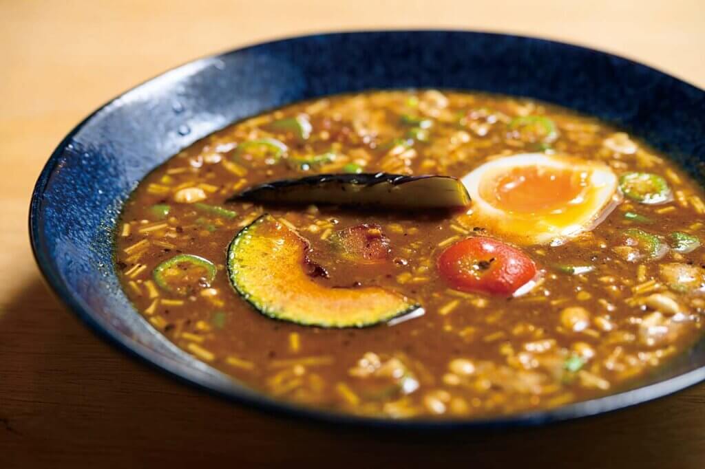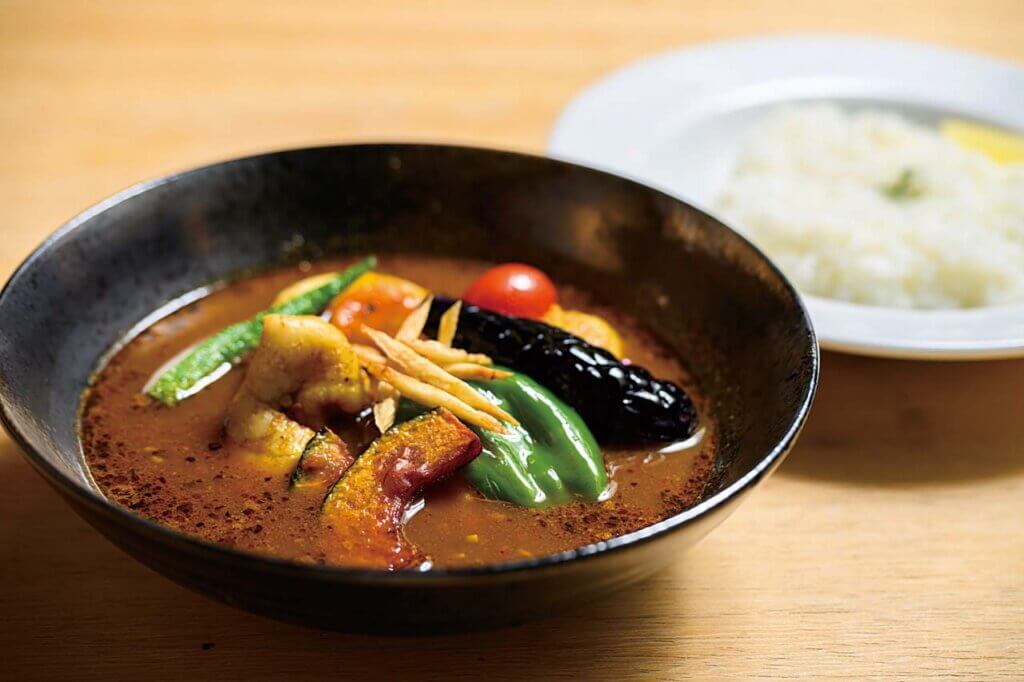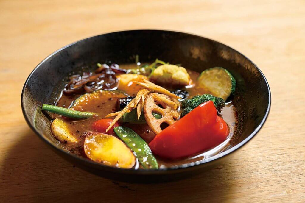 札幌市の狸小路を中心に広く食べ歩き研究を重ねたスープカレーは、ポークとチキンのスープに和風のだし、15種以上のスパイスを配合した奥行きのある味わい。辛さは0から20レベル、ご飯の量は5段階から選べ、トッピングは14種もあります。小千谷市の季節野菜を存分に味わえるのも大きなポイント。