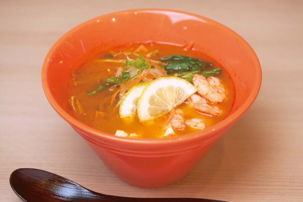 ぷりぷりのエビが入った、トムヤムクン スープ単品(1,078円)。スープだけのオーダーもOK。