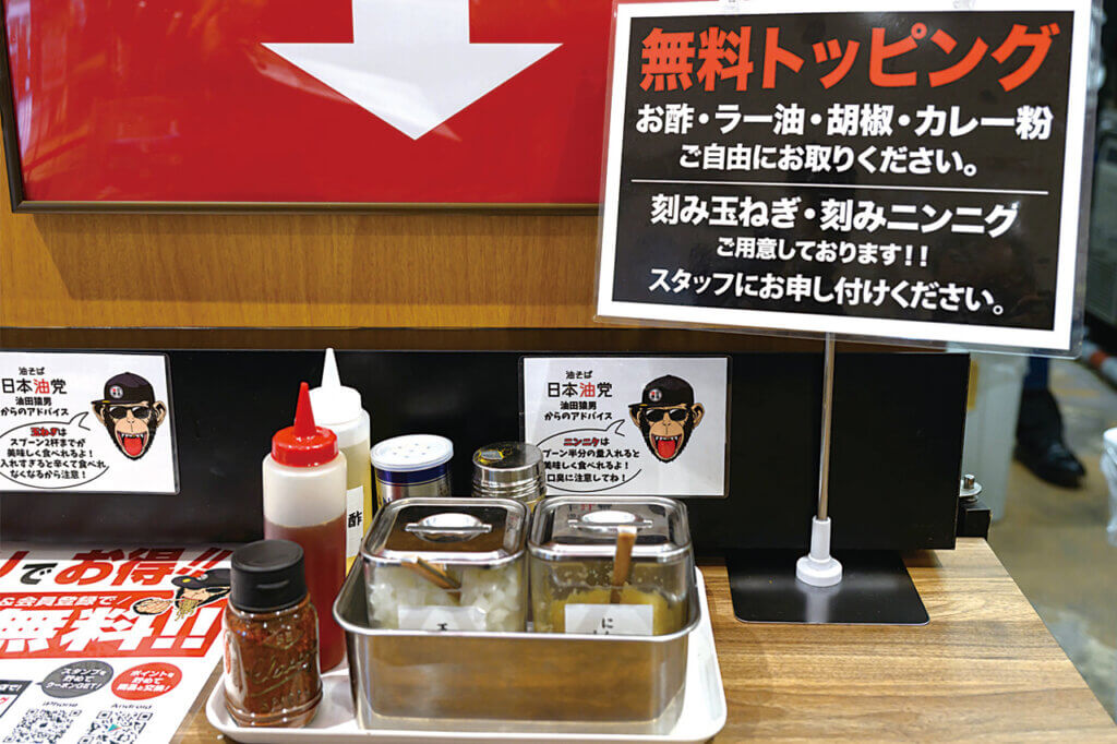 さらにフライドオニオンや温玉といった10種の有料トッピング(50円〜)で、最後まで味変しながら楽しめる。さらに麺の大盛りは無料なので、ガッツリ食べたいときにもぴったり。