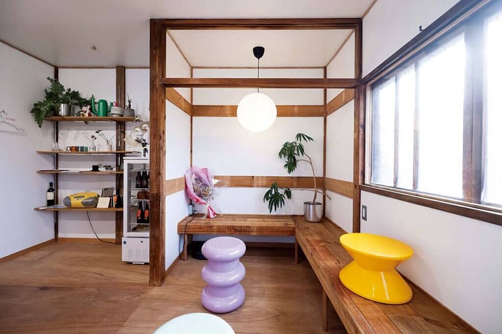 古材で作られたベンチなどレトロとモダンが交わるデザイン。