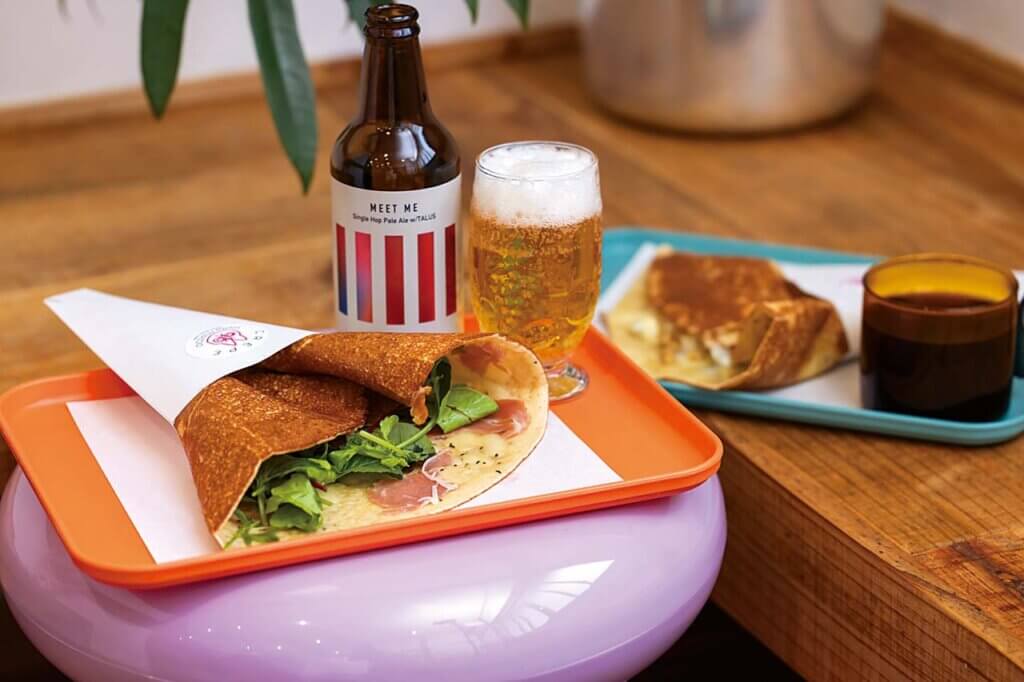 看板は上越産米粉とアーモンドプードルを配合したオリジナル生地で作るシュガーバタークレープです。鉄板の上の生地表面に、バターをたっぷりと塗り、きび砂糖をふりかけラム酒で香り付け。シンプルな組み合わせで焼きたて生地のパリパリ&もっちり感を楽しめます。このクレープをベースにした、チョコレートやブルーチーズ、ツナマヨなど多彩なアレンジも魅力的です。