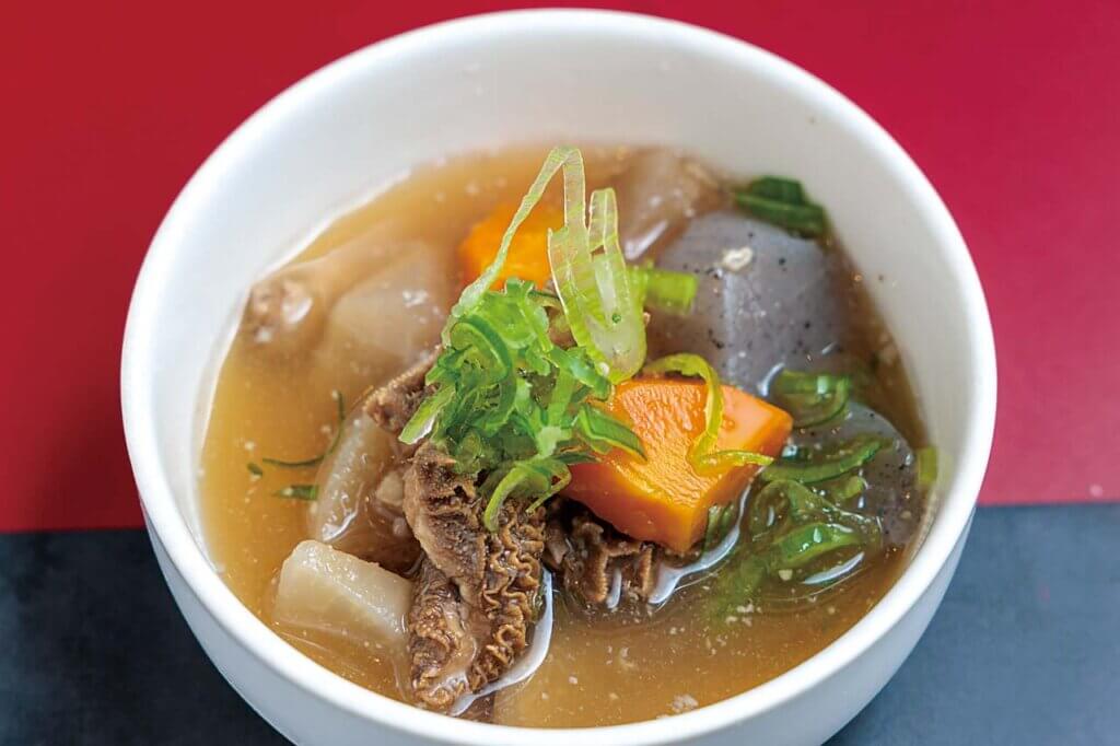 さまざまな部位が楽しめる牛モツ煮はお通し(400円)の定番。根菜にモツのうま味がよく染み込んでいます。