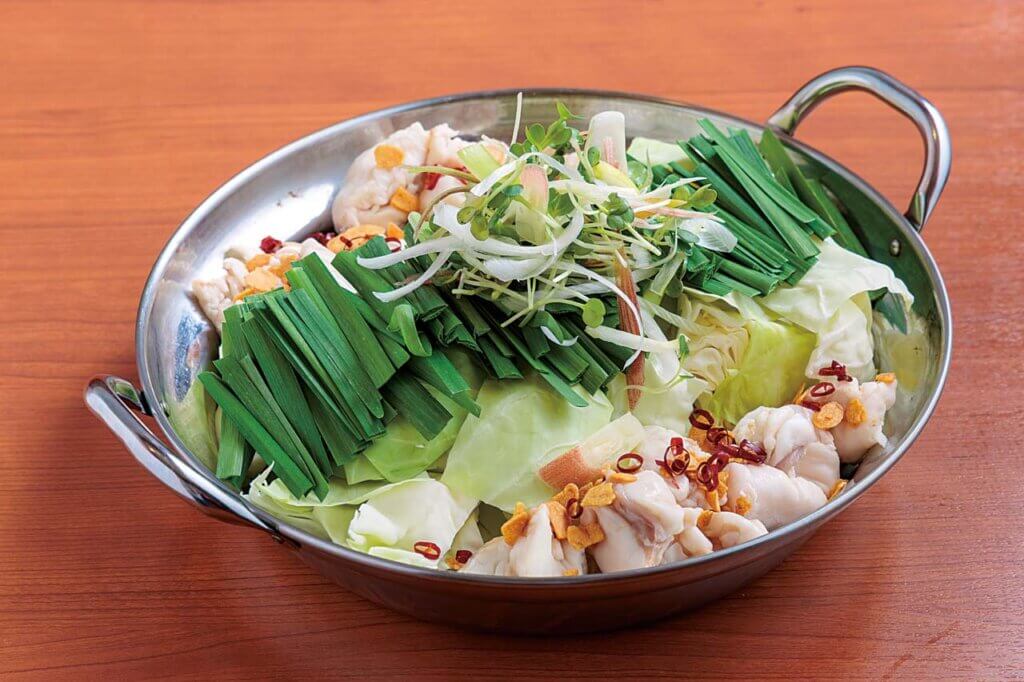 濃厚とんこつなど4種類のスープから選べる、名物 博多和牛もつ鍋(968円)。2人前からオーダーできます。