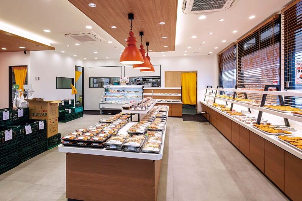 広くゆったりした店内では、栄養のバランスを考えた種類豊富なお弁当や、名物の鶏タレかつなどの揚げ物を揚げたてで提供。こだわりの新鮮野菜や果物も、手頃な価格で販売します。