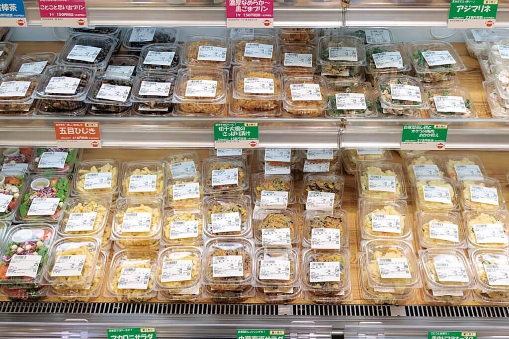 惣菜はパックに詰めて冷蔵ケースで販売。和洋中と種類も豊富にそろいます。