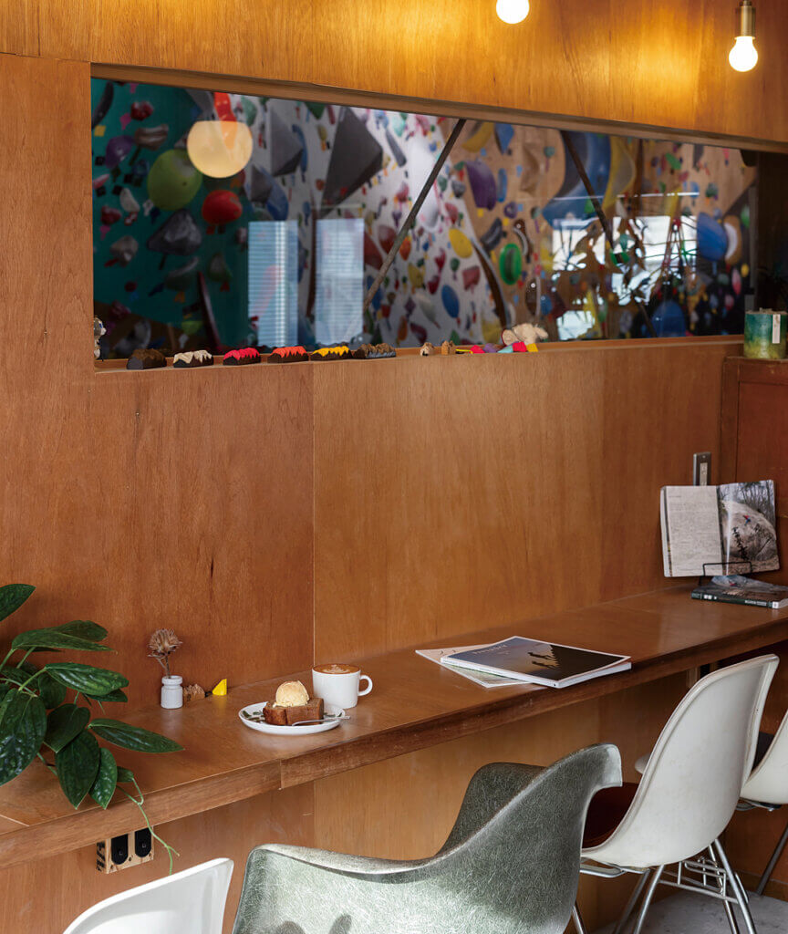 コーヒーや日替わりの焼き菓子を提供するカフェは気軽に入りやすい雰囲気で、もちろんカフェのみの利用もOK。クライミングの前後や休憩に利用したり、コーヒー目当てに訪れたり、使い方はさまざま。