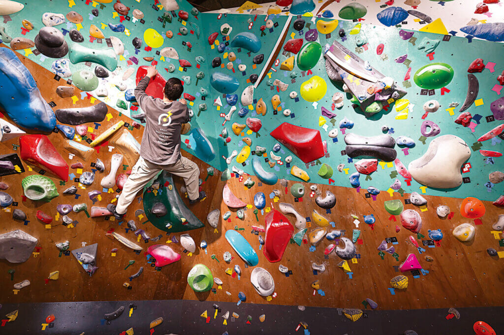 同じ建物にクライミングジムとカフェが共存するこちら。扉を開けると、右手の壁一面にカラフルなボルダリングウオールがそびえ立ち、左手にはカフェへつながる扉が。
