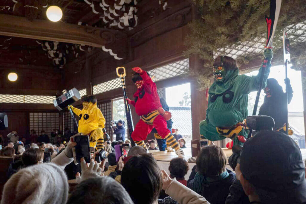 三条市にある法華宗総本山本成寺で行われる節分の一大行事。本成寺本堂の厳粛な空気の中に響きわたる鬼たちの叫び声と金棒・斧などの金物を持ち大暴れするその姿は迫力満点。最後は鬼に豆をまいて退散させ、平和と安全を祈ります。